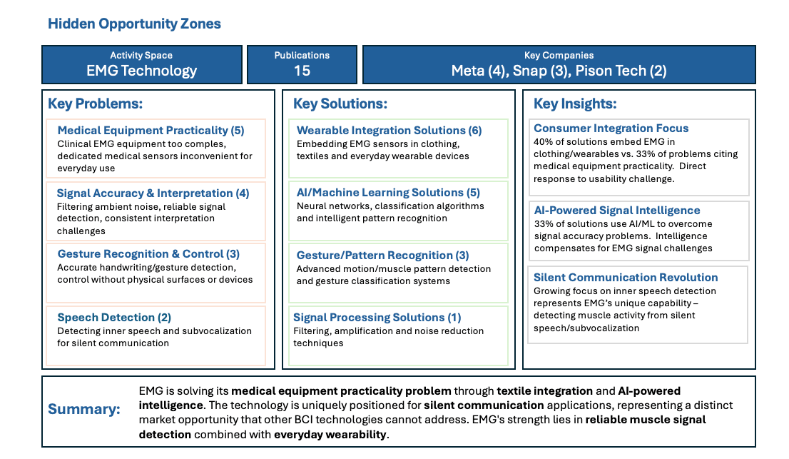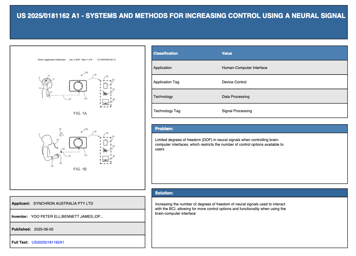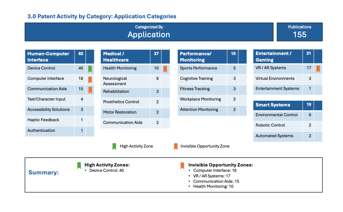 We analyzed 150+ published patent applications in the BCI space published between January 2025 and June 2025, covering every major player from tech giants to breakthrough startups. This isn’t just data—it’s actionable competitive intelligence.